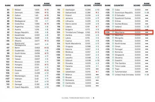 وحلت موريتانيا في المرتبة 135 عالمياً، وهي الرتبة الأخيرة على المؤشر الذي يرصد مخاطر «الإرهاب»، وتقاسمت موريتانيا الرتبة مع 29 دولة أخرى، سجلت نسبة «صفر إرهاب»، خلال العام الجاري.