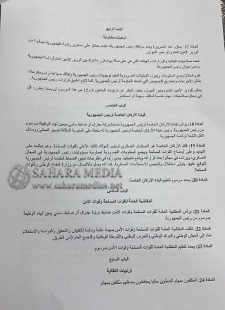 وتضمن المرسوم الجديد ثمانية أبواب، وزعت على مصالح رئاسة الجمهورية: الأمانة العامة لرئاسة الجمهورية والوزير المستشار لدى رئاسة الجمهورية، وديوان رئيس الجمهورية، وقيادة الأركان الخاصة لرئيس الجمهورية، والمفتشية العامة للقوات المسلحة وقوات الأمن.