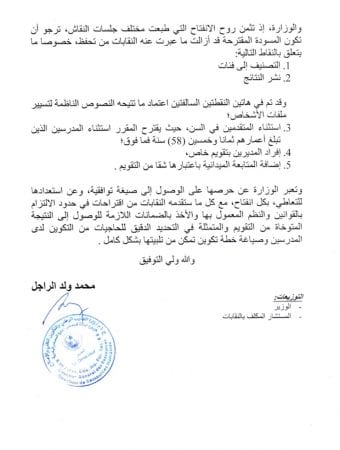 وأشارت الوزارة إلى أن المسودة الجديدة تأتي بعد «حوار دار بين الوزارة ومختلف الطيف النقابي»، قبل أن تضيف أنه «تبعا لما تم الاتفاق عليه، تتقدم بمسودة المقرر التنفيذي للتقويم المرفقة، وتدعو كافة الطيف النقابي إلى حضور جلسة نقاش لتدارس هذه المسودة».
