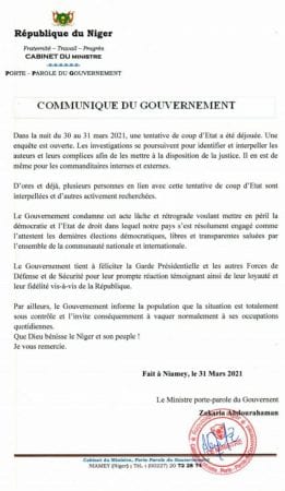 وهنأت الحكومة النيجرية قوات الحرس الرئاسي وباقي قوات الدفاع والأمن على «ردة فعلها الآنية التي تنم عن إخلاصها وولائها للجمهورية».