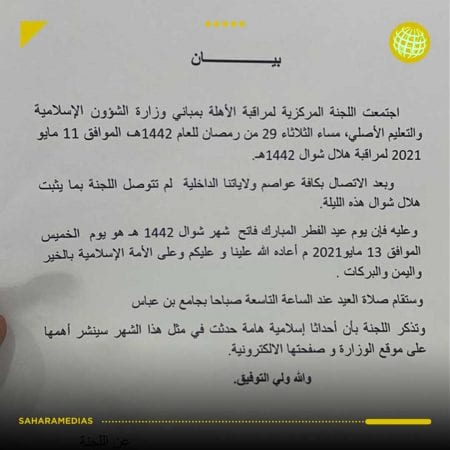 وأضافت اللجنة، أنه بعد تعذر رؤيته، فإن الخميس 13 مايو أول أيام عيد الفطر، وأن الأربعاء مكمل لشهر رمضان المبارك.