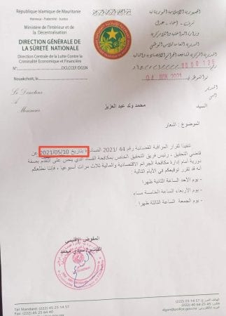 أبلغت المديرية المركزية لمكافحة الجرائم الاقتصادية والمالية، بإدارة الأمن، الرئيس الموريتاني السابق محمد ولد عبد العزيز بمواعيد جديدة لتسجيل توقيعه في إطار الإقابة الجبرية المفروضة عليه منذ عدة أسابيع.