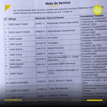 أجرت وزارة التهذيب الوطني وإصلاح النظام التعليمي، اليوم الخميس، تعديلات واسعة في المدراء الجهويين للتعليم، شملت عدة ولايات من ضمنها ولايات نواكشوط ونواذيبو.