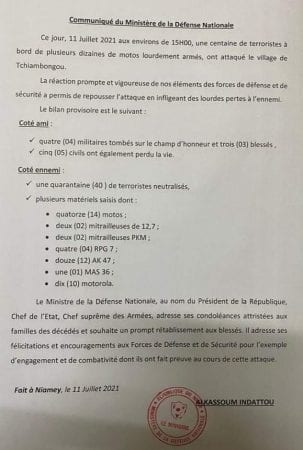 وقالت وزارة الدفاع النيجرية في بيان صحفي إن المسلحين شنوا هجوما على منطقة «تيلابيري»، غربي النيجر بالقرب من مالي، عند حوالي الساعة الثالثة زوالا بالتوقيت المحلي.