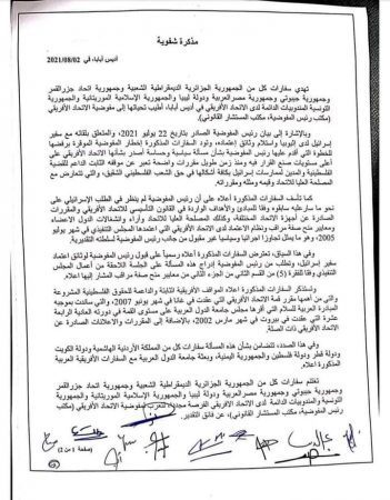 وذكرت الرسالة بما قالت إنها «المواقف الأفريقية الثابتة والداعمة للحقوق الفلسطينية المشروعة، والتي من أهمها مقرر قمة الاتحاد الأفريقي التي عقدت في غانا في شهر يونيو 2007، والتي ساندت بموجبه المبادرة العربية للسلام».