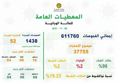 وسجلت موريتانيا منذ شهر مارس من عام 2020، بداية وصول الجائحة إلى البلاد، 37755 إصابة مؤكدة بالفيروس، كانت نسبة الوفاة فيها 2 في المائة، والشفاء وصلت إلى 96 في المائة، مع وجود 2 في المائة من الحالات النشطة.