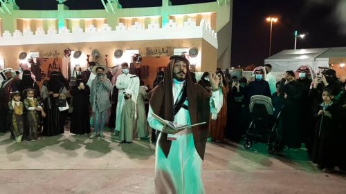 وقف الخطيب الشاب وسط الجموع، يرتدي ثوبا أبيض اللون، تعلوه غترة بنية وعقال أسود، كان يحملُ في يده كتابًا على هيئة مخطوط قديم، يتحرك بخفة كبيرة، ويتحدث بفصاحة نجدية، يورد الشواهد ويلقي الأشعار، في محاكاة واضحة لأجواء الأسواق قبل عدة قرون.