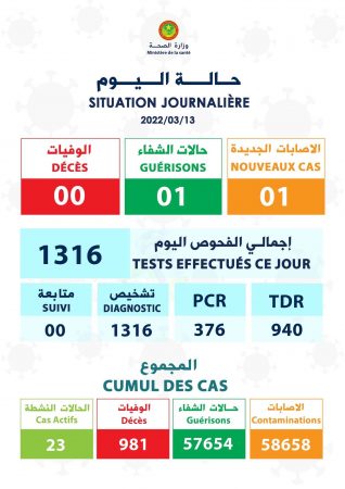 أعلنت وزارة الصحة في موريتانيا اليوم الأحد، تسجيل إصابة واحدة بكورونا، خلال الأربع والعشرين ساعة الأخيرة.