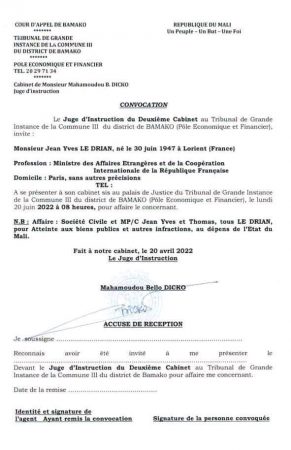 وفي وثيقة موقعة في العشرين من شهر أبريل الفائت، استدعى قاضي التحقيق في محكمة الاستئناف بباماكو، رئيس الدبلوماسية الفرنسية جان إيف لودريان للحضور أمام المحكمة في 20 يونيو المقبل.
