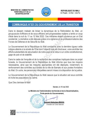 وجاء في بيان صادر عن السلطات الانتقالية أن مجموعة من الضباط وضباط الصف حاولت قلب نظام الحكم ليل 11 وحتى 12 مايو الجاري، بدعم من دولة غربية، قبل أن تضيف أن “المحاولة الانقلابية أحبطت بفضل اليقظة والمهنية التي تتمتع بها قوات الأمن والدفاع في مالي”.