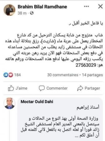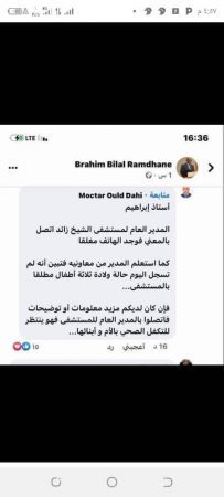 بعد دقائق من نشر بلال رمظان المنشور، علق له وزير الصحة المختار ولد داهي الذي قال إنه اتصل بإدارة مستشفى الشيخ زايد من أجل التكفل بهذه الحالة.