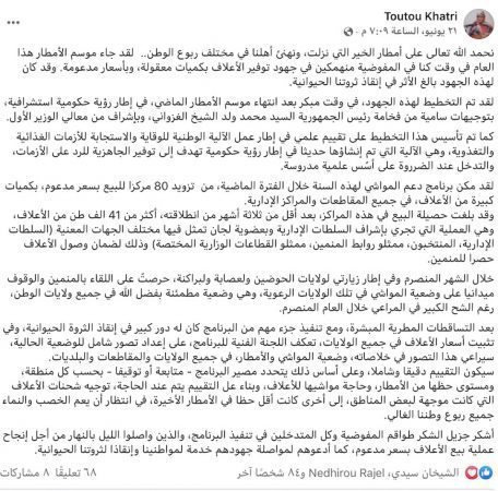 وأضافت بنت خطري في تدوينة نشرتها على حسابها في فيس بوك أن عملية بيع الأعلاف بسعر مدعوم لهذا العام مكنت من « إنقاذ الثروة الحيوانية، كما ساهمت بشكل كبير في تثبيت أسعار الأعلاف على عموم التراب الوطني ».