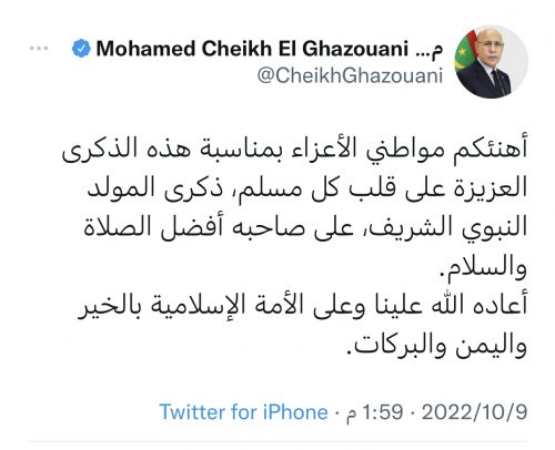 هنأالرئيس الموريتاني محمد ولد الشيخ الغزواني اليوم الأحد في تغريدة له على حسابه في نويتر، الموريتانيين بمناسبة ذكرى المولد النبوي الشريف.