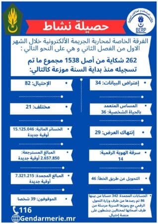 وقالت الفرقة في حصيلتها، إنها سجلت 262 شكاية خلال الشهر؛ ويتصدر الاحتيال الرقمي هذه الشكايات، كما تشمل التحويل عن طريق الخطأ والمساس بالحياة الشخصية واعتراض البيانات وانتهاك العرض وسرقة الهوية الرقمية.