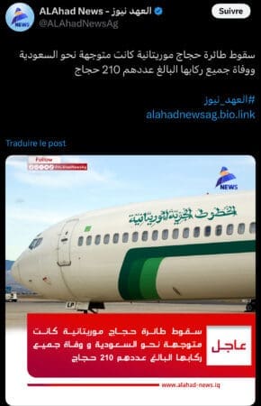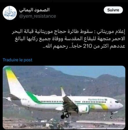 وتداولت هذه الحسابات صورًا ومقاطع فيديو قديمة على أنها توثق حادثًا لطائرة موريتانية سقطت وعلى متنها 210 حاج، كانت متوجهة إلى المملكة العربية السعودية. أحد الحسابات ذهب إلى حد القول إن الطائرة “سقطت في البحر الأحمر، وإن جميع ركابها لقوا حتفهم”.