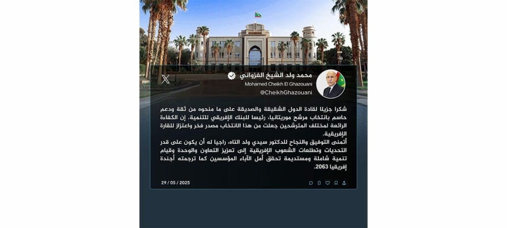 وعبّر ولد الغزواني في تغريدة على منصة “أكس” عن جزيل شكره “للدول الشقيقة والصديقة على ما منحوه من ثقة ودعم حاسم بانتخاب مرشح موريتانيا، رئيساً للبنك الأفريقي.”