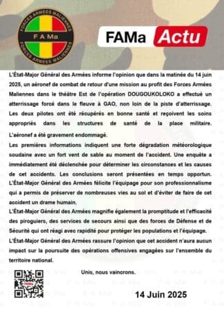 بدوره، قدم الجيش المالي روايته للحادث في بيان صادر يوم 14 يونيو، أكد فيه أن الطائرة أجرت هبوطاً اضطرارياً في نهر بمدينة غاو، شمال البلاد، بعد عودتها من مهمة عسكرية في إطار عملية “دوغوكولوكو” شرق مالي.