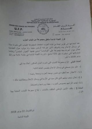 ولد مولود طالب بمعاقبة هؤلاء الشباب وفق نصوص الحزب، نظراً لما ألحقوه من ضرر بوحدة الحزب وتماسكه، وهو ما عارضه جناح يقوده ولد بدر الدين، اعتبر أنه لا يمكن معاقبة الشباب على إبداء وجهة نظرهم.