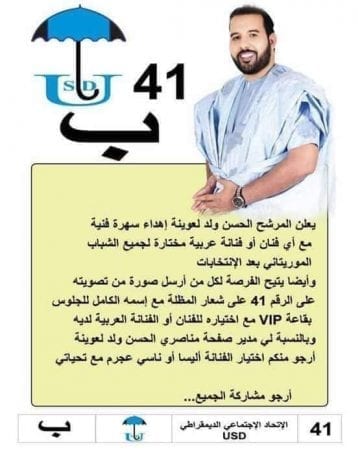 ولم يتوقف مدير حملة المرشح هنا، بل طالب كل من يصوت للمرشح، بإرسال صورة توثق عملية تصويته، ليضمن الجلوس قرب الفنان في الحفل، ذلك الفنان الذي لن يزور نواكشوط والحفل الذي لن ينظم، لأن المرشح لم يحصل على أكثر من 600 صوتٍ، تضعه في ذيل الترتيب.