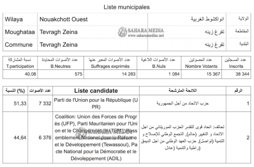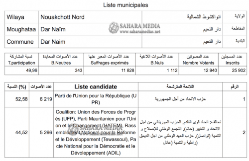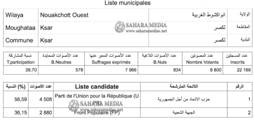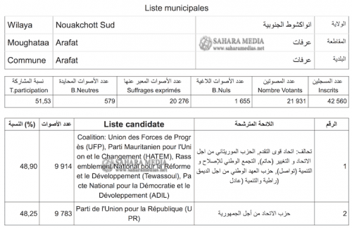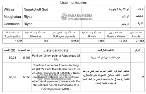 تمكن حزب الاتحاد من أجل الجمهورية الحاكم في الشوط الثاني من الانتخابات البلدية، من حسم ست بلديات في العاصمة نواكشوط، وذلك من أصل تسع بلديات.