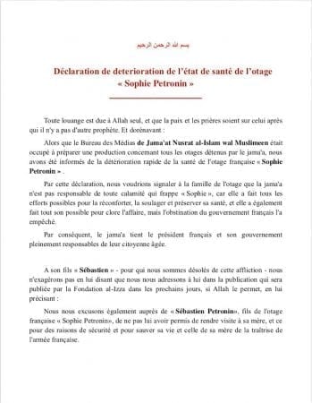 اليوم، وبعد بيان جماعة نصرة الإسلام والمسلمين، يبدو واضحاً أن الجماعة تخشى أن يختطف المرض « صوفي » قبل أن تتم صفقة تحريرها مع الفرنسيين، أم أن الجماعة قد تفرج عنها بسبب وضعها الصحي، وهو ما سبق وأن حدث.