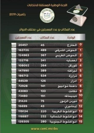 وفي تيريس ازمور وصل عدد المسجلين 31420 يتوزعون على 75 مكتبا، وفي انشيري وصل عدد الناخبين 16699 يتوزعون على 43 مكتبا، وفي نواكشوط الغربية وصل عدد المسجلين 119134 يتوزعون 220 مكتبا، وفي نواكشوط الشمالية وصل على 118887 يتوزعون على 232مكتبا، وفي نواكشوط الجنوبية وصل العدد 139305 يتوزعون على 280 مكتبا.