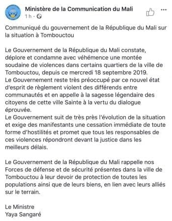 الحكومة في تعليقها على أعمال العنف دعت جنود الجيش المالي إلى «حماية جميع السكان وحماية ممتلكاتهم بالتعاون مع حلفائهم على الأرض»، مؤكدة أنها تندد بما وقع في المدينة واصفة ما جرى بأنه «مفاجئ».