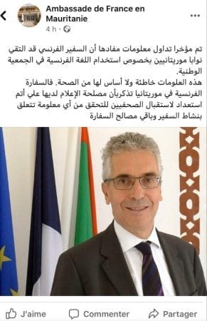 نفت السفارة الفرنسية في موريتانيا، اليوم الجمعة ، الأخبار المتداولة في بعض وسائل الإعلام المحلي عن اجتماع عقده السفير بمجوعة من النواب ، بخصوص استخدام اللغة الفرنسية في الجمعية الوطنية.