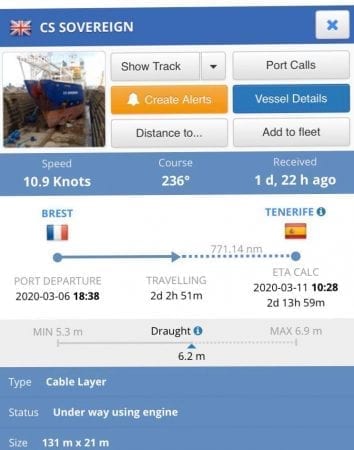 يظهر موقع رادار مراقبة السفن أن السفينة البريطانية CS Sovereign التي ستعمل على إصلاح خلل الكابل البحري ، ستصل جزر “تنريفي” الإسبانية بعد يومين و 13 ساعة ، حيث ستجري توقفا ، وبعد ذلك ستتوجه إلى موريتانيا.