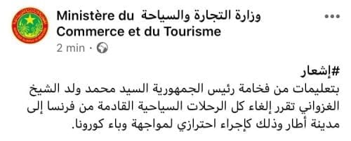 وقالت وزارة التجارة والسياحة عبر صفحتها على الفيسبوك إن قرار إلغاء الرحليت جاء بتعليمات من الرئيس محمد ولد الشيخ الغزواني.