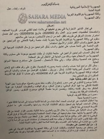 أعلنت وكالة الجمهورية بنواكشوط الغربية، مساء اليوم الثلاثاء، إنشاء منصة رقمية خاصة باستقبال الشكايات، وذلك بعد تعليق جلسات المحاكم كإجراء احترازي من فيروس «كورونا» المستجد، وذلك عبر استخدام تطبيق «واتساب» الأكثر استخداماً من طرف الموريتانيين.