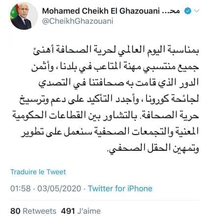 وقال الرئيس الموريتاني “بمناسبة اليوم العالمي لحرية الصحافة أهنئ جميع منتسبي مهنة المتاعب في بلدنا، وأثمن الدور الذي قامت به صحافتنا في التصدي لجائحة كورونا، وأجدد التأكيد على دعم وترسيخ حرية الصحافة. بالتشاور بين القطاعات الحكومية المعنية والتجمعات الصحفية سنعمل على تطوير وتمهين الحقل الصحفي”.