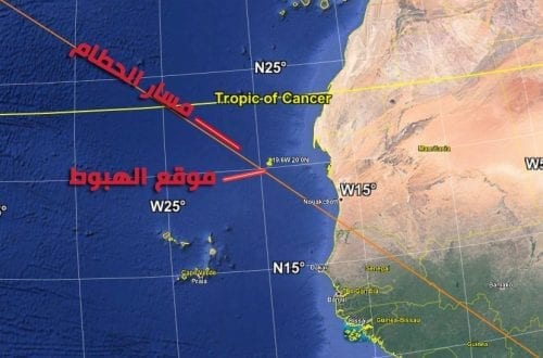 ولكن الحطام وبعد أن مر من فوق مدينتي نيويورك ولوس أنجلوس الأمريكيتين، سقط في المحيط الأطلسي دقائق قليلة قبيل المرور فوق مدينة نواكشوط، وكان موقع سقوطه قبالة حوض أركين، وفق ما تظهر صور الأقمار الصناعية.