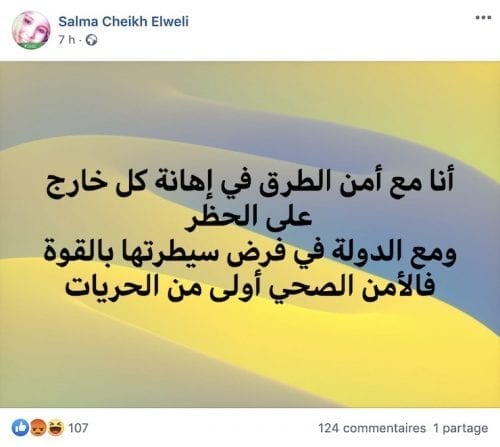 في هذا السياق كتبت الصحفية والناشطة السالمة بنت الشيخ الولي: «أنا مع أمن الطرق في إهانة كل خارج على الحظر، ومع الدولة في فرض سيطرتها بالقوة، فالأمن الصحي أولى من الحريات»، وقد حظيت هذه التدوينة بالكثير من التعليقات المتباينة.