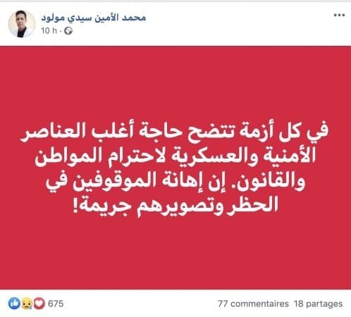 في غضون ذلك قالت اللجنة الوطنية لحقوق الإنسان إنها اطلعت على «مشاهد يتعرض فيها مواطنون موريتانيون للإهانة على يد عناصر من الأمن بحجة انتهاكهم لحظر التجول»، وأضافت أنه «لا يخامرها أدنى شك أن الأمر يتعلق بأفعال معزولة لأشخاص غير مهنيين ويجهلون حدود صلاحياتهم ولا يمثلون قيم المصالح الأمنية والعسكرية التي يتبعون لها».