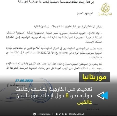 وجاء في التعميم أنه « يطلب من الموظفين الدبلوماسيين في الدوائر الدبلوماسية أعلاه، والذين تم استدعائهم للإدارة المركزية بموجب مذكرة الوزارة رقم 4593 بتاريخ 14 مايو 2020، الاستعداد للعودة إلى نواكشوط عبر هذه الرحلات».