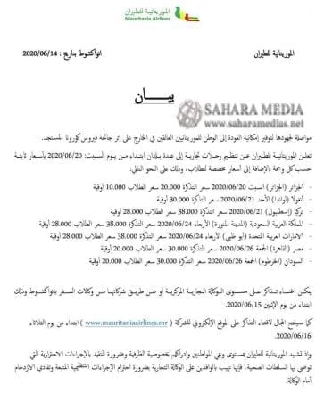وقالت الشركة في بيان صحفي إن هذه الرحلات تأتي «مواصلة لجهود توفير إمكانية العودة إلى الوطن للموريتانيين العالقين في الخارج إثر جائحة كورونا المستجد».