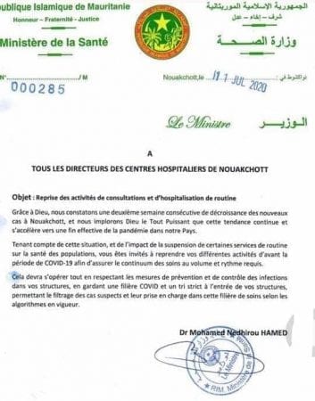 دعت وزارة الصحة الموريتانية المستشفيات في العاصمة نواكشوط إلى استئناف الاستشارات الطبية الروتينية بعد انحسار الإصابات الجديدة بفيروس «كورونا» في نواكشوط.
