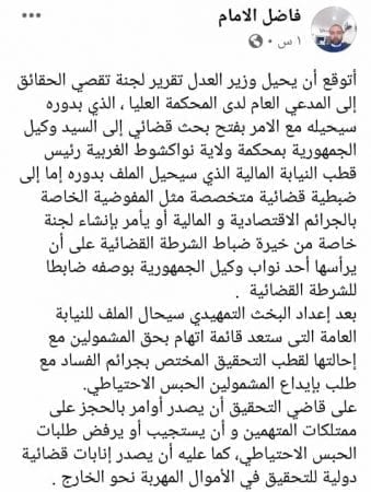 وحول المسار المتوقع للملف، كتب القاضي فاضل ولد الإمام عبر صفحته على الفيسبوك، أنه يتوقع أن «يحيل وزير العدل تقرير لجنة تقصي الحقائق إلى المدعي العام لدى المحكمة العليا، الذي بدوره سيحيله مع الأمر بفتح بحث قضائي إلى السيد وكيل الجمهورية بمحكمة ولاية نواكشوط الغربية، رئيس قطب النيابة المالية الذي سيحيل الملف بدوره إما إلى ضبطية قضائية متخصصة مثل المفوضية الخاصة بالجرائم الاقتصادية والمالية أو يأمر بإنشاء لجنة خاصة من خيرة ضباط الشرطة القضائية على أن يرأسها أحد نواب وكيل الجمهورية بوصفه ضابطا للشرطة القضائية».