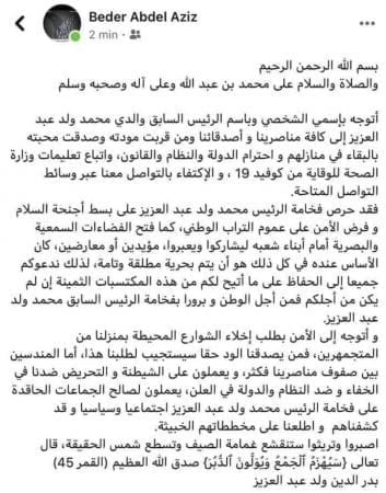 ونشر نجل الرئيس السابق بدر ولد عبد العزيز، عبر الفيسبوك منشوراً يدعو فيه من وصفهم بأنهم «مناصرينا وأصدقائنا» إلى البقاء في منازلهم واحترام الدولة والنظام والقانون.